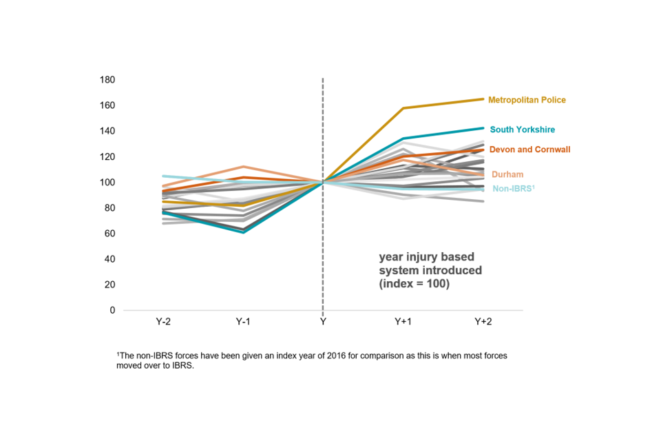 Chart 1 shows that the size of the increase in serious casualties varies across police forces following the introduction of injury based reporting systems. A comparison line for non-IBRS forces has been included to show how reported serious casualties have changed in these forces. Some forces (such as the Metropolitan Police Service) show a more marked increase in serious casualties than others, while other forces (such as Durham) show a more stable trend in serious casualties over time. Devon and Cornwall and South Yorkshire have also been highlighted in Chart 1 to illustrate the variety of trends observed.