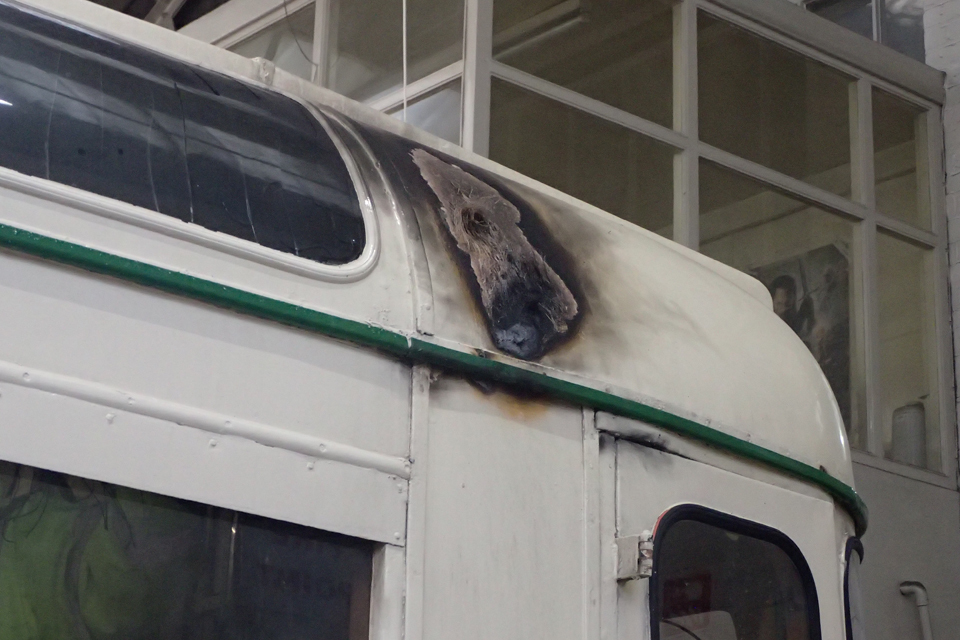 External scorching to the bodywork of tram 272. A large patch of blackened paintwork can be seen.