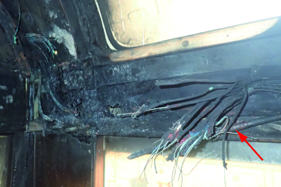 Fire damaged cabling within the roof space of tram 272. The previous cable repair is indicated by a large red arrow on the right hand side.