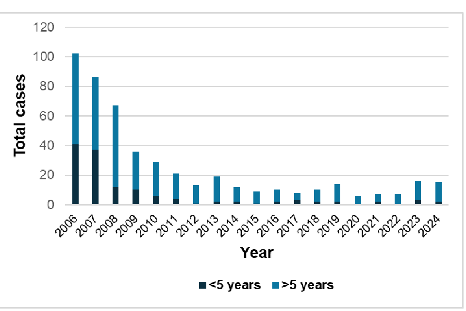 Total cases of Haemophilus influenzae type b by year, 2006 to 2024