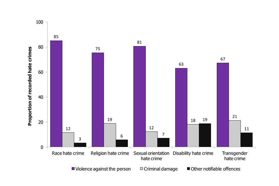 The next most common offence type for hate crimes was criminal damage (for example, 19% of religion hate crimes and 18% of disability hate crimes involved criminal damage); the remainder of hate crimes were accounted for by a range of other notifiable offences, such as theft offences, burglary and sexual offences.