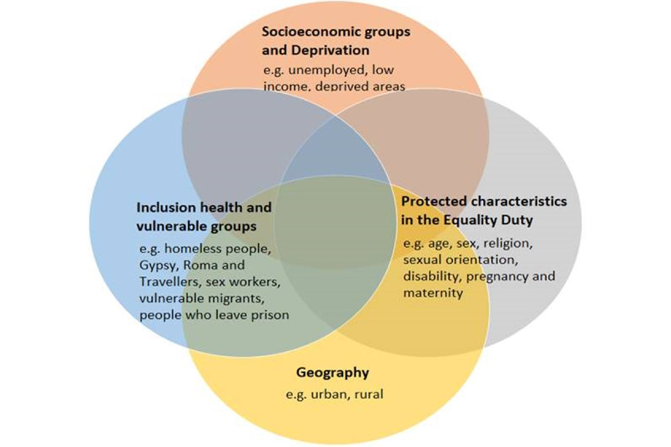 - inequalities impacted by structural discrimination which results in some groups and individuals - for example, those who identify with one or more of the protected characteristics - experiencing poorer access to services and poorer outcomes