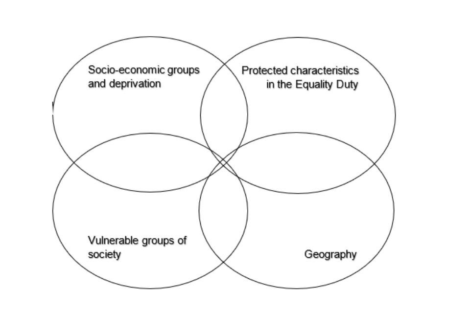 Venn diagram with four overlapping circles (1. Socio-economic/deprivation, 2. Equality and diversity, 3. Inclusion health, 4. Geography) to show the synergies/overlap between the groups that are usually considered for health inequalities