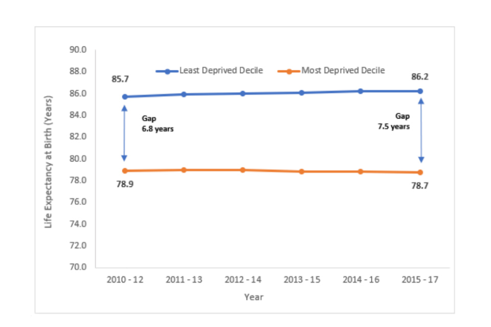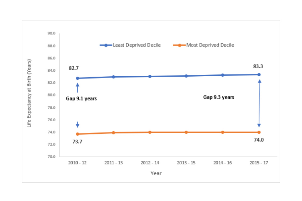 Health is not just about the length of life we live, but also the quality of life. The gap in healthy life expectancy (years lived in good health) between the most and least deprived areas of England was around 19 years for both males and females from 2015 to 2017 [footnote 15].