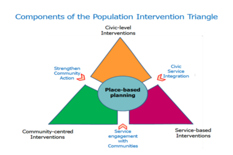 Figure 12 shows the Population Intervention Triangle split into 3, to represent the civic, service and community-centred elements.