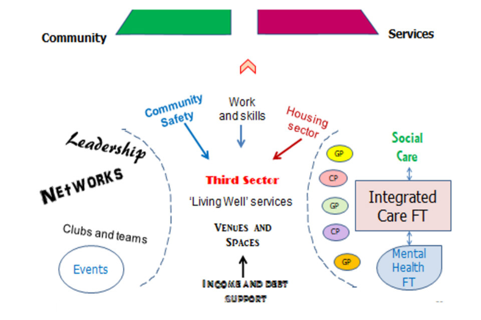 Meanwhile, in the world of health and care services there is a range of organisations with their own cultures and values working hard to embrace integration to bring care closer to home and increase community engagement (the right-hand side).