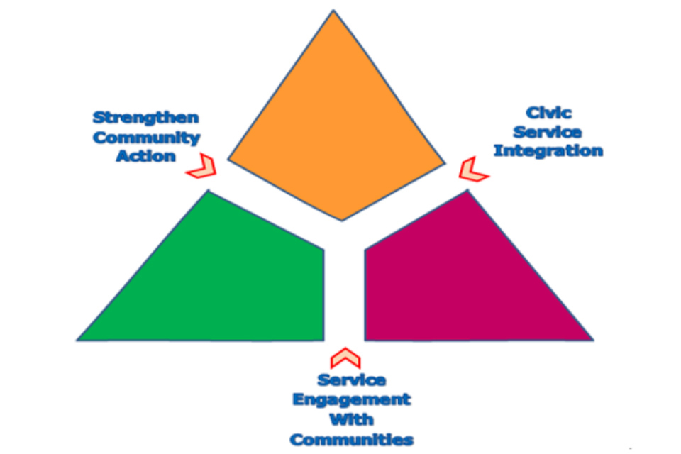Figure 15 depicts three triangles – each divided into the three seams of civic, community and service.