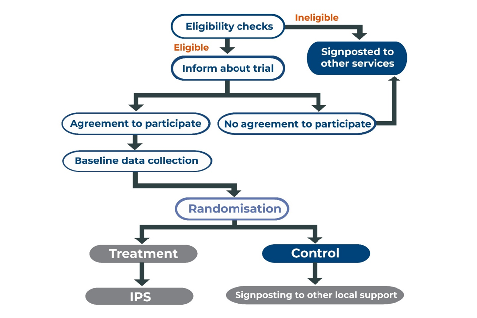 | Employment specialists | Staff employed by the trials to undertake randomisation appointments, provide IPS support to the treatment group, and undertake employer engagement |