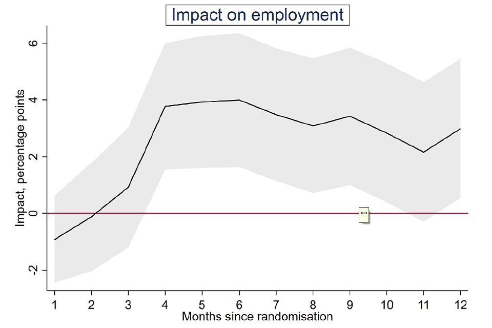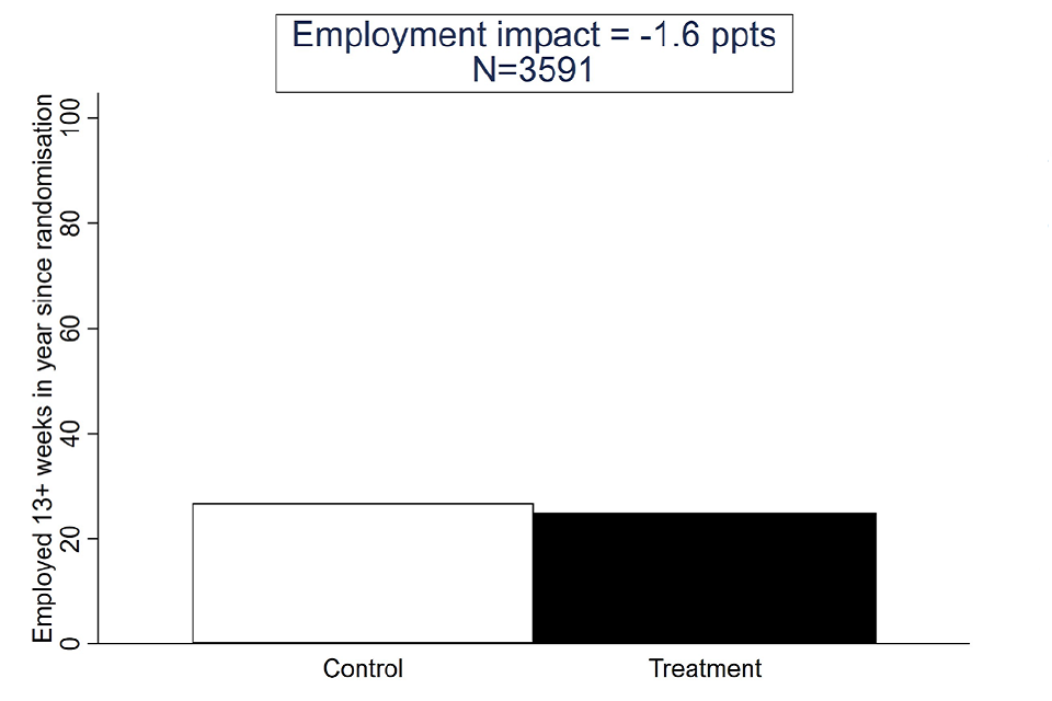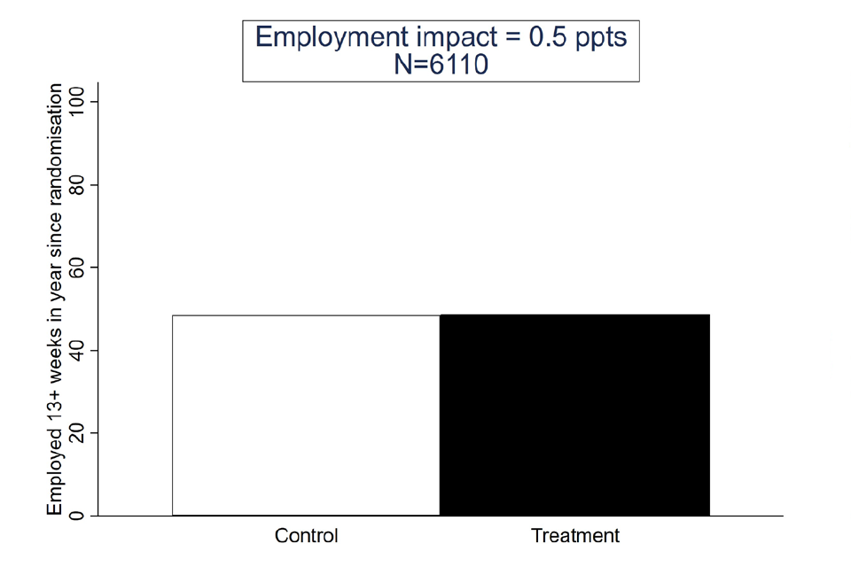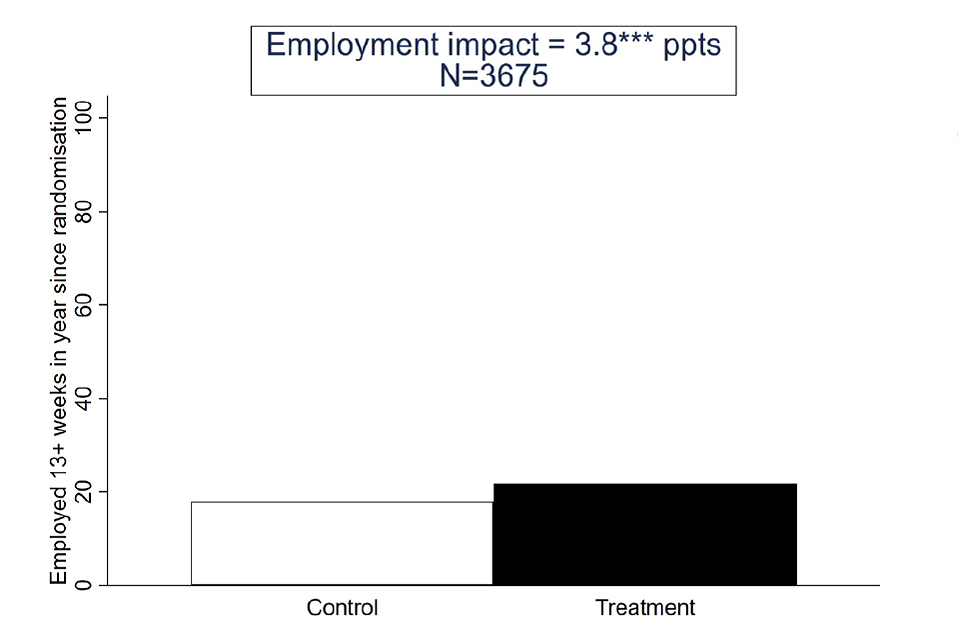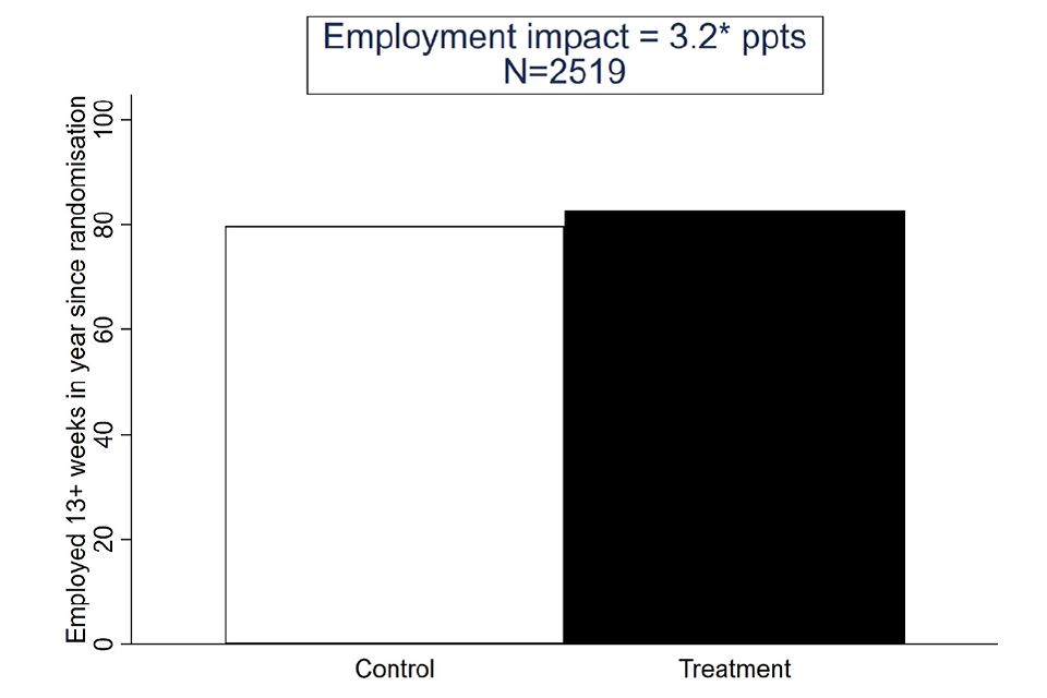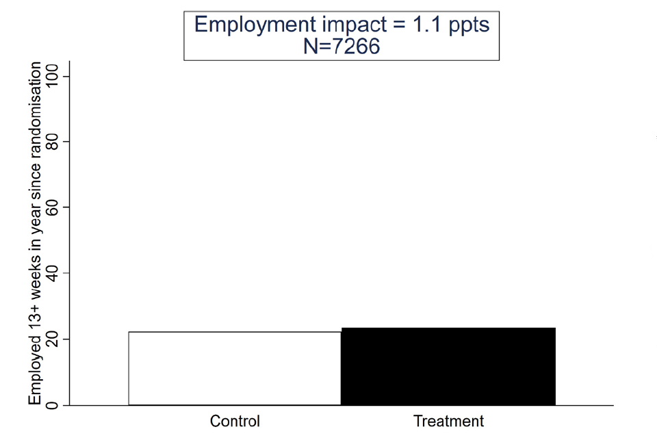 - among those in WMCA, there was a positive impact on employment, significant at the 99% confidence level. The treatment group were 4 percentage points more likely to have been in work for 13 or more weeks in the year following randomisation than the control group. However, there were no significant impacts on earnings, or health and wellbeing outcomes.