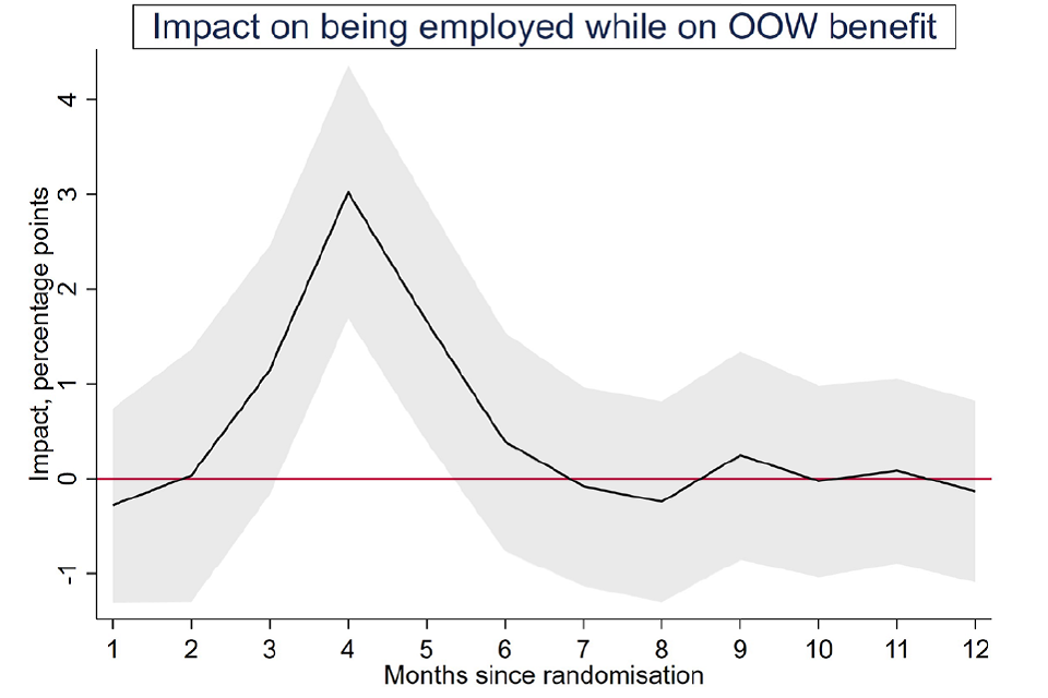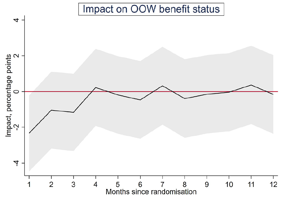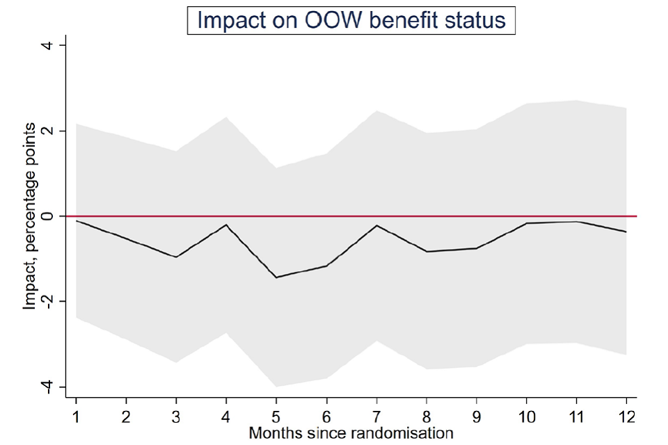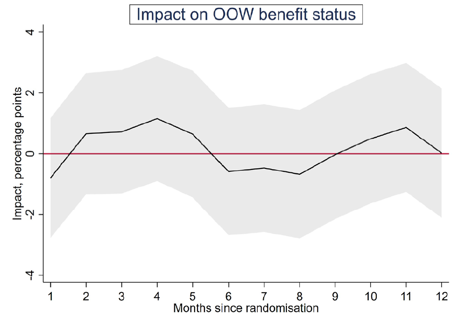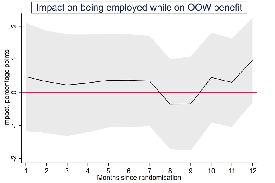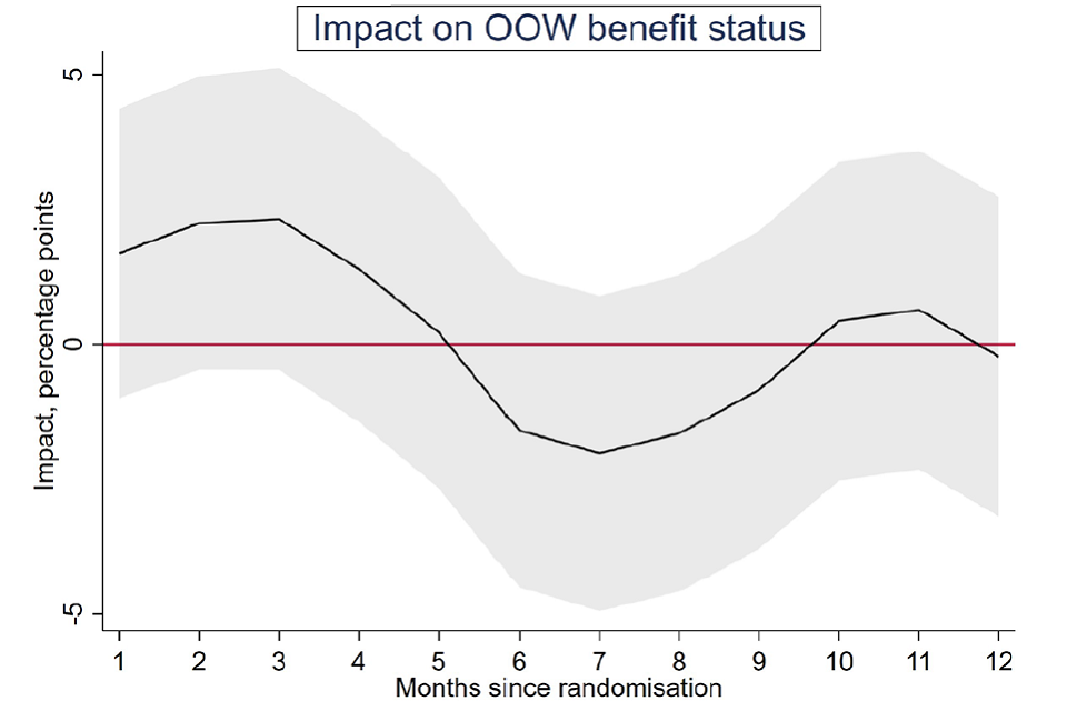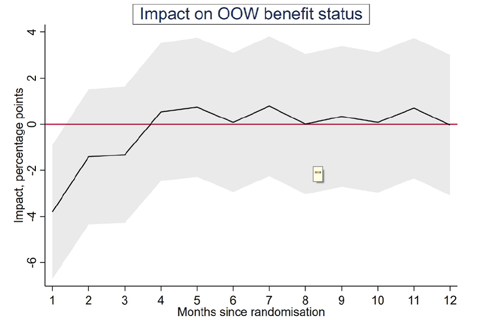 | Employed and on OOW benefits in month 12, % (DWP/HMRC) | 2.6 | 2.8 | 0.3 | 0.4 | – | 0.42 | 0.97 | – | 7,266 |