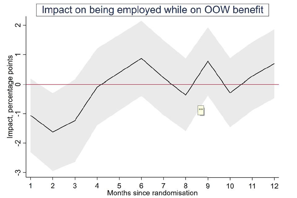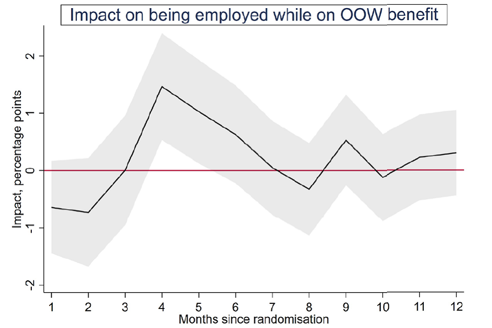 - for the SCR out-of-work (OOW) group, being assigned to the treatment group had no statistically significant effect on either employment or earnings. Small positive impacts were seen for health and wellbeing, significant at the 90% confidence level.
