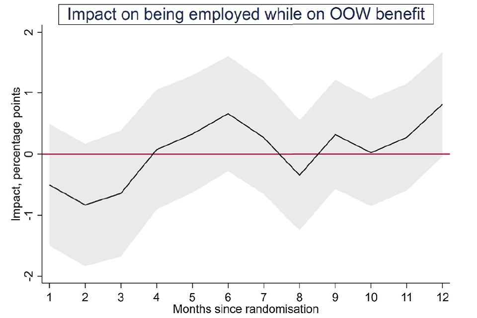 | Employed and on OOW benefits in month 12, % (DWP/HMRC) | 2.3 | 2.2 | -0.1 | 0.5 | – | 0.78 | 0.99 | – | 3675 |