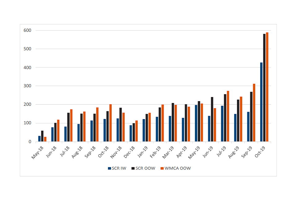 The trials recruited between 8 May 2018 and 31 October 2019. Over this time, 9,785 individuals were randomised. Table 1.1 shows that, of these, 4,896 were assigned to the treatment group and 4,889 were assigned to the control group. Among recruits as a whole, this 50/50 split was visible within all trial groups: SCR IW, SCR OOW and WMCA.