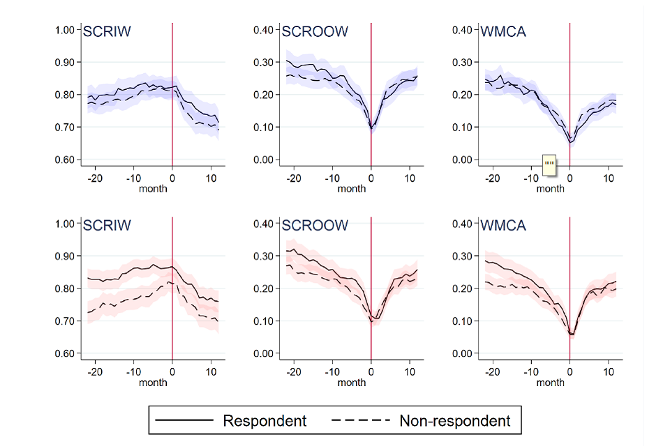 Nevertheless, the fact that respondents account for less than half of all trial recruits raises a question about the representativeness of impacts estimated on that group. Survey weights are used in an attempt to address this. Appendix A1 shows, using linked HMRC data, that survey respondents are more likely than non-respondents to have been in work prior to randomisation. After applying weights, these differences mostly disappear. For SCR IW, however, this was not the case. Furthermore, the fact that this mainly affects the treatment group rather than the control group raises a concern around whether estimated impacts for survey outcomes can be regarded as purely causal for SCR IW.