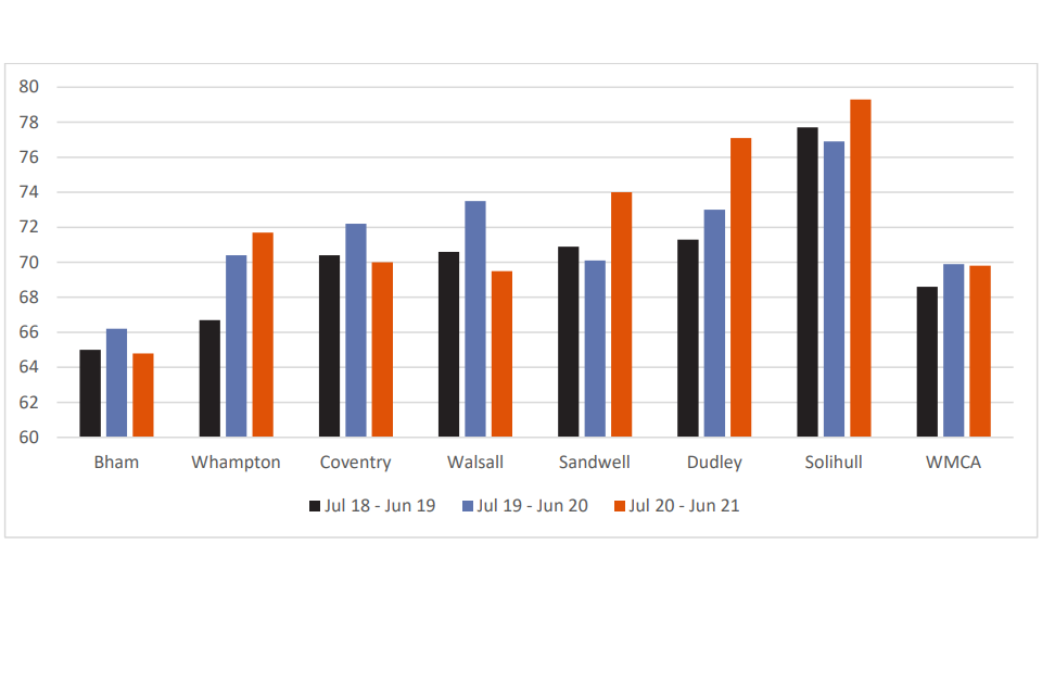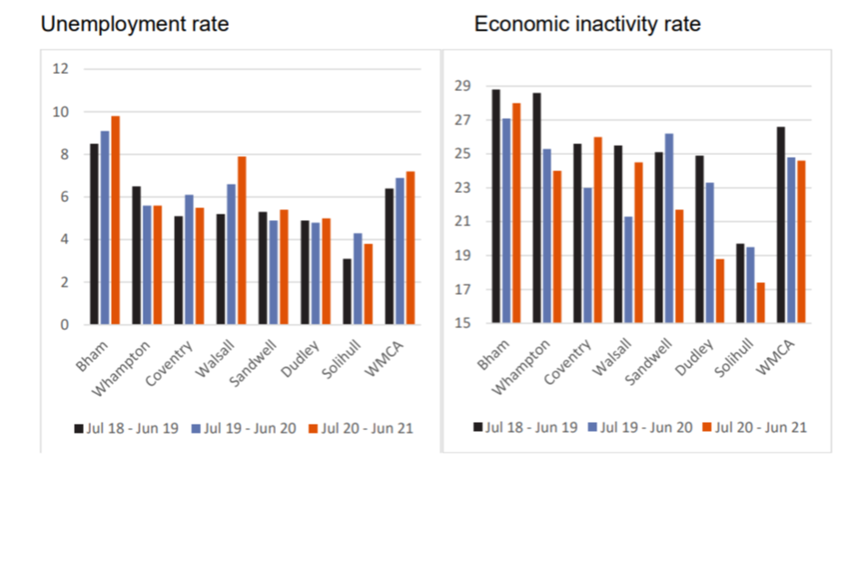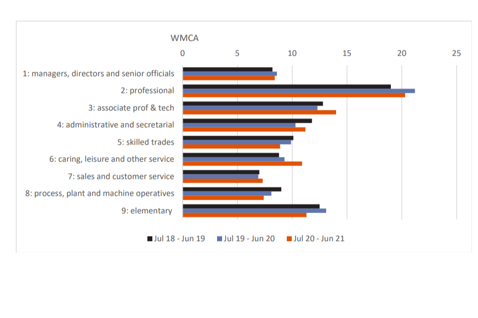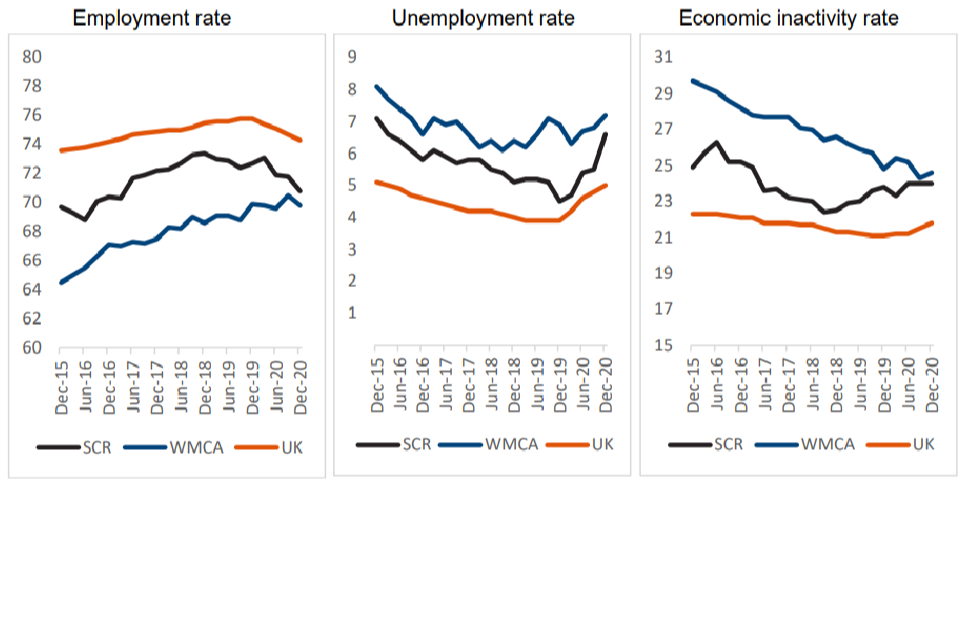 Labour market analysis indicated West Midlands Combined Authority (WMCA) had seen employment continue to grow, driven by higher participation for women. Sheffield City region [footnote 1] (SCR) saw employment fall overall, and signs of higher economic inactivity due to long term ill health and pandemic related reasons. Both regions saw some employment growth in relatively lower skilled jobs.