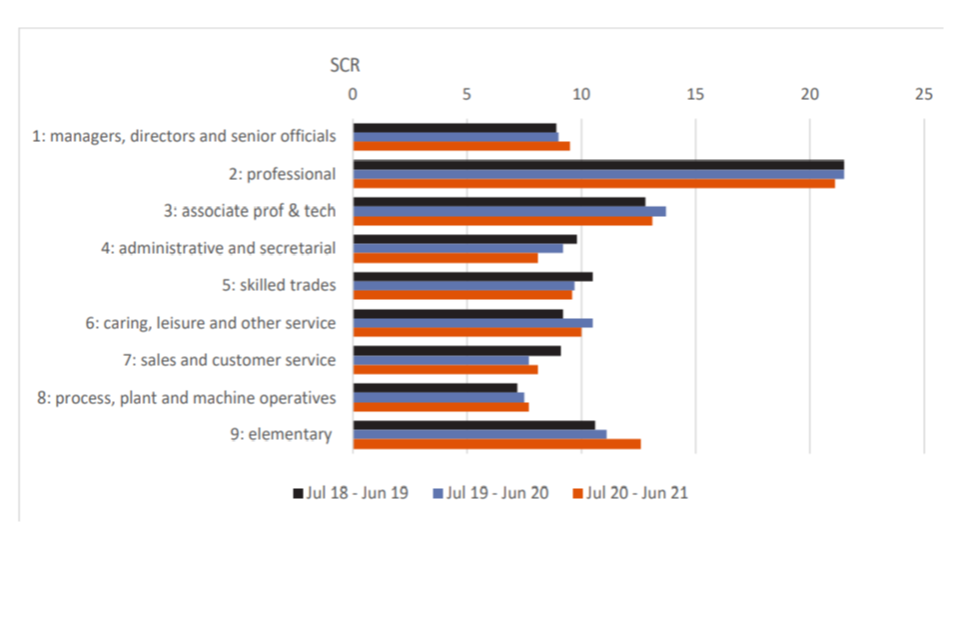 SCR also saw falls in health professions (affecting both women and men), as well as large declines in jobs related to leisure and transport (likely taxi drivers). However, unlike WMCA, jobs in administration and customer service appeared to decline, while sales jobs, elementary administration and services actually increased. On the latter category, given the disproportionate impact of the pandemic on hospitality, this suggests that other jobs within this group rose by enough to offset this, perhaps including industrial cleaning or storage (for example, related to online deliveries).