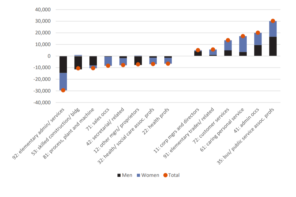 In the WMCA the largest fall was in elementary administration and services, which includes most bar and restaurant staff as well as cleaners. This also shows that the falls related to construction particularly affected men, while falls in secretarial work and some health professions were primarily among women (counterintuitively, the pandemic overall has seen employment fall in a number of health professions including nursing). At the same time, the occupations with highest growth appear to have benefited women more than men, in administrative roles, customer services and social care.