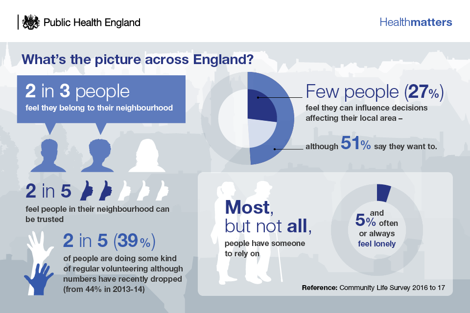 The findings of the Community Life Survey 2016 to 2017 indicate the picture across England in terms of people’s feelings towards their communities and their role within them. In 2016 to 2017, 2 in 3 people said they feel they belong to their neighbourhood and 2 in 5 feel people in their neighbourhood can be trusted.