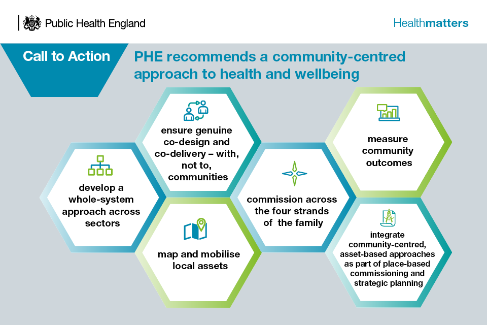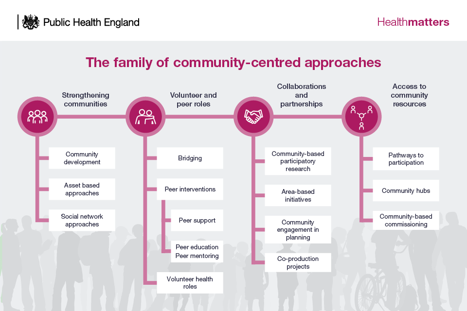 The ‘family of community-centred approaches’ has been developed as a framework to represent some of the practical and evidence-based options that can be used to improve community health and wellbeing and reduce health inequalities. PHE has published guidance on using the family model.