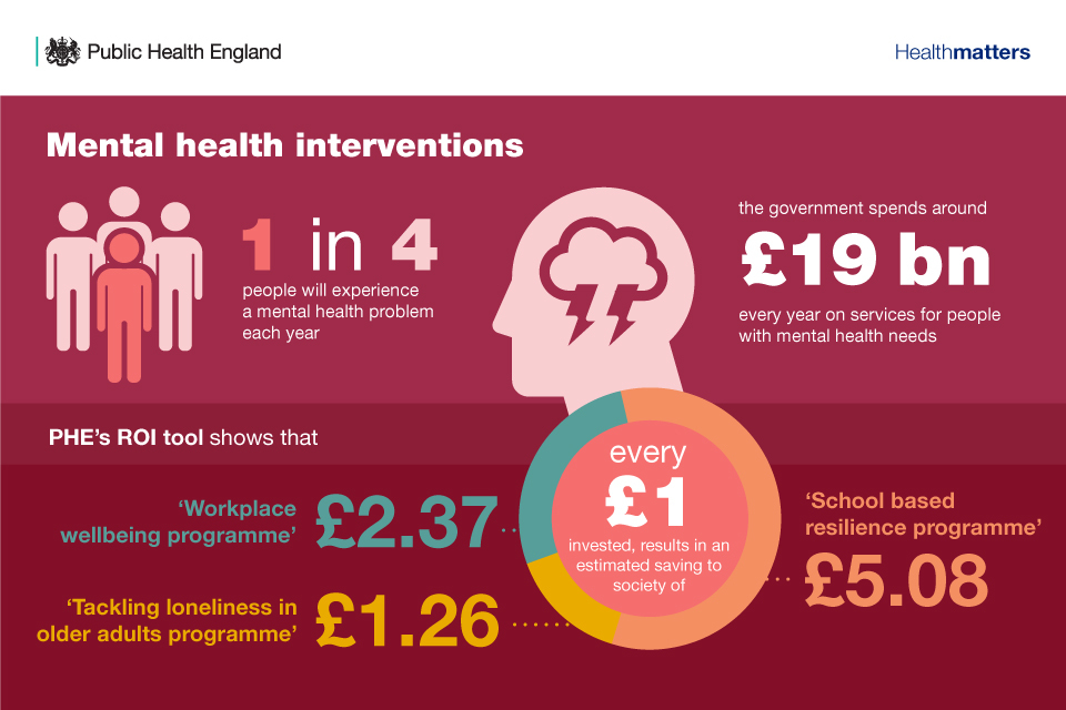 There is clear evidence proving that a range of prevention activities promote good mental health and reduce some of the impacts of poor mental health. These actions have also been shown to be cost-effective as a good way of spending money on activities that improve health outcomes, that is, they yield a good ROI. This evidence is summarised in PHE’s commissioning report.