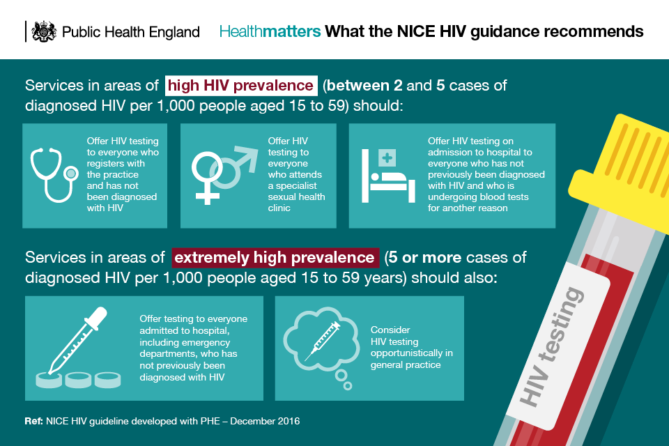 NICE has worked with PHE to develop new HIV guidance that defines a prevalence of between 2 and 5 diagnosed HIV cases per 1,000 people aged 15 to 59 as being a high prevalence area that may require additional testing interventions.