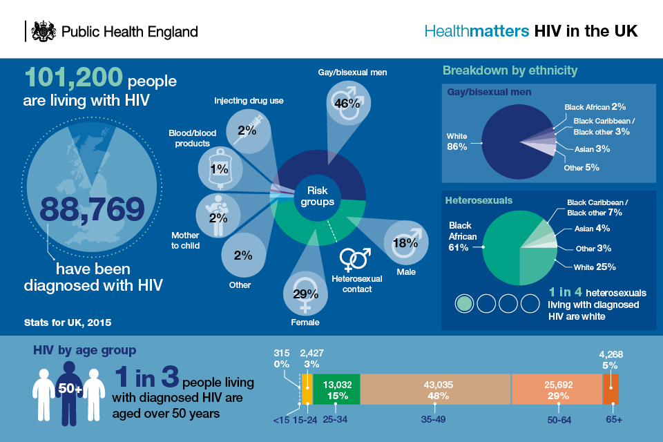 An estimated 101,200 people were living with HIV in the UK in 2015. Of these, around 1 in 8 (13%) were unaware that they were living with the virus and may be at risk of passing it on.