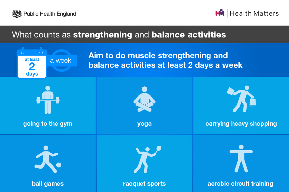 What counts as strengthening and balance activities: going to the gym, yoga, carrying heavy shopping, ball games, racquet sports, aerobic circuit training