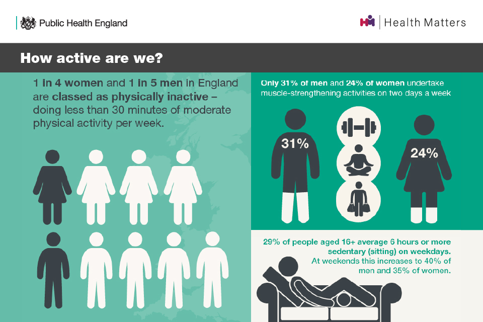 Use PHE’s Public health and outcomes framework and Physical Activity Fingertip tool to identify the percentage of physically active and inactive adults in your local area.