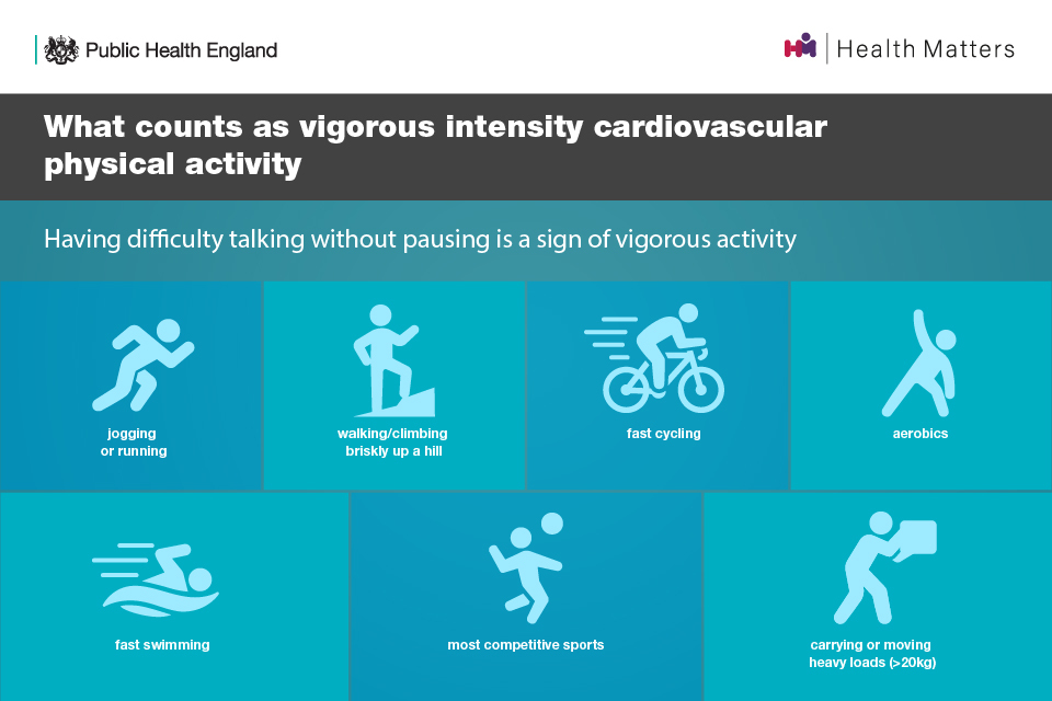 What counts as vigorous intensity cardiovascular physical activity: jogging or running, walking/climbing briskly up a hill, fast cycling, aerobics, fast swimming, most competitive sports, carrying or moving heavy loads