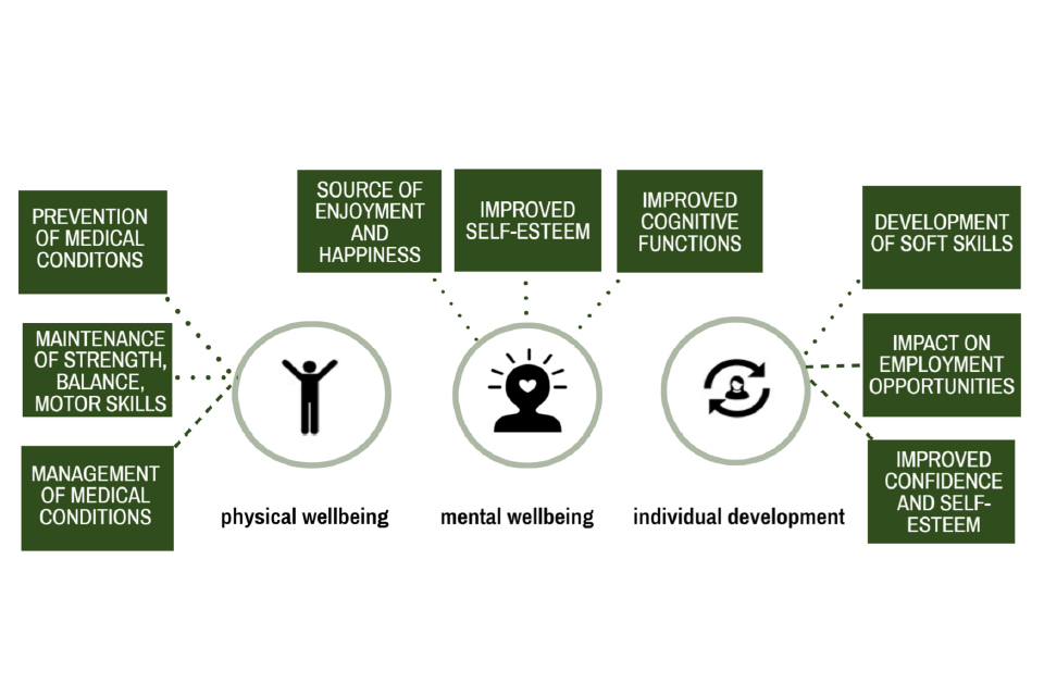 Wider benefits come primarily from physical activities undertaken in a community setting such as walking, cycling, active recreation, sport and play. They include: