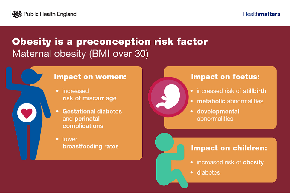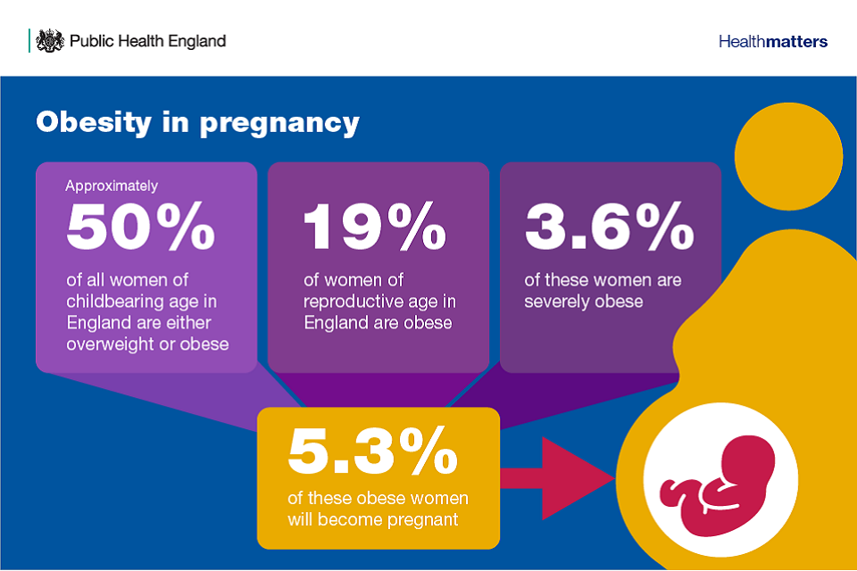 Rates of obesity are increasing among women of reproductive age and an increasing number of women who become pregnant are obese - 19% of women of reproductive age in England are obese, 3.6% are severely obese, and of these obese women 5.3% will become pregnant each year.