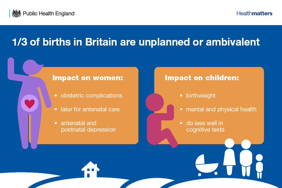 A planned pregnancy is likely to be a healthier one, as unplanned pregnancies represent a missed opportunity to optimise pre-pregnancy health. Currently, 45% of pregnancies and one third of births in England are unplanned or associated with feelings of ambivalence. Although pregnancies continuing to term mostly lead to positive outcomes, some unplanned pregnancies can have adverse health impacts for mother, baby and children into later in life.