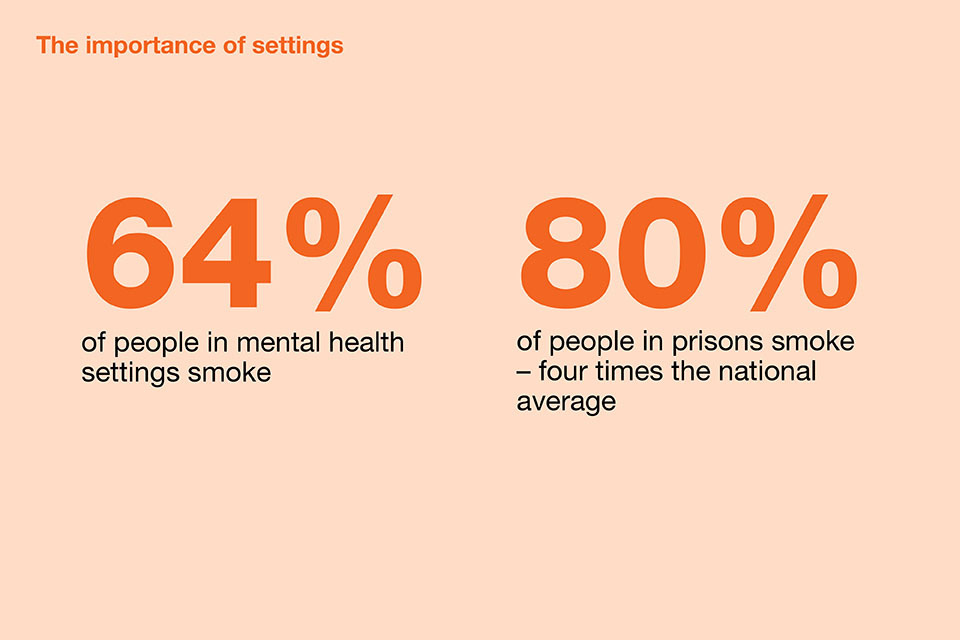 Smoking cessation should be a priority in settings where prevalence is high, such as prisons and mental health units. This can be promoted via smokefree grounds and buildings, and with on site stop smoking services.