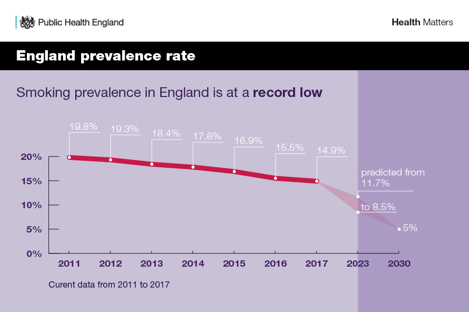 The adult smoking rate in England continues to decline year on year and is now at a record low. In 2017, 14.9% of people in England aged 18 years and above smoked, accounting for 6.1 million people. If this trend continues, it will reduce to between 8.5% and 11.7% by 2023. PHE is calling for the NHS long-term plan to commit to achieving a smokefree society by 2030 with an adult prevalence of 5% or less.