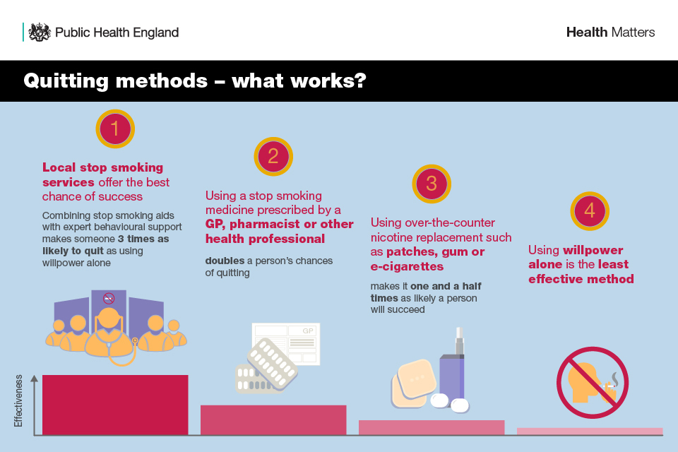 Currently, around half of all smokers in England try to quit unaided using willpower alone, despite this being the least effective method. Getting support can greatly increase a person’s chances of quitting successfully: