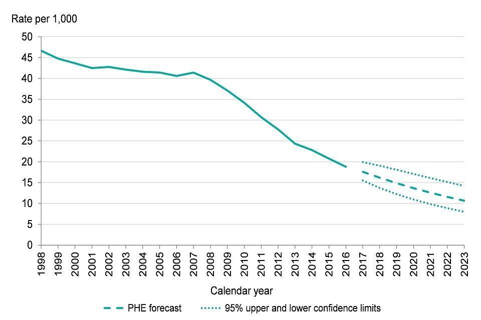Figure 2: trend in under 18 conception rate, England, 1998 to 2016, forecasts up to 2023 [Source: Public Health Outcomes Framework]