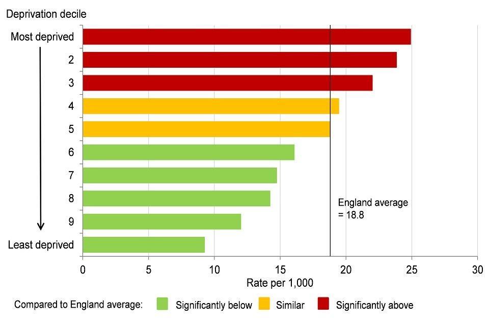 Figure 3: under 18 conception rates by deprivation decile*, England, 2016 [Source: Public Health Outcomes Framework]