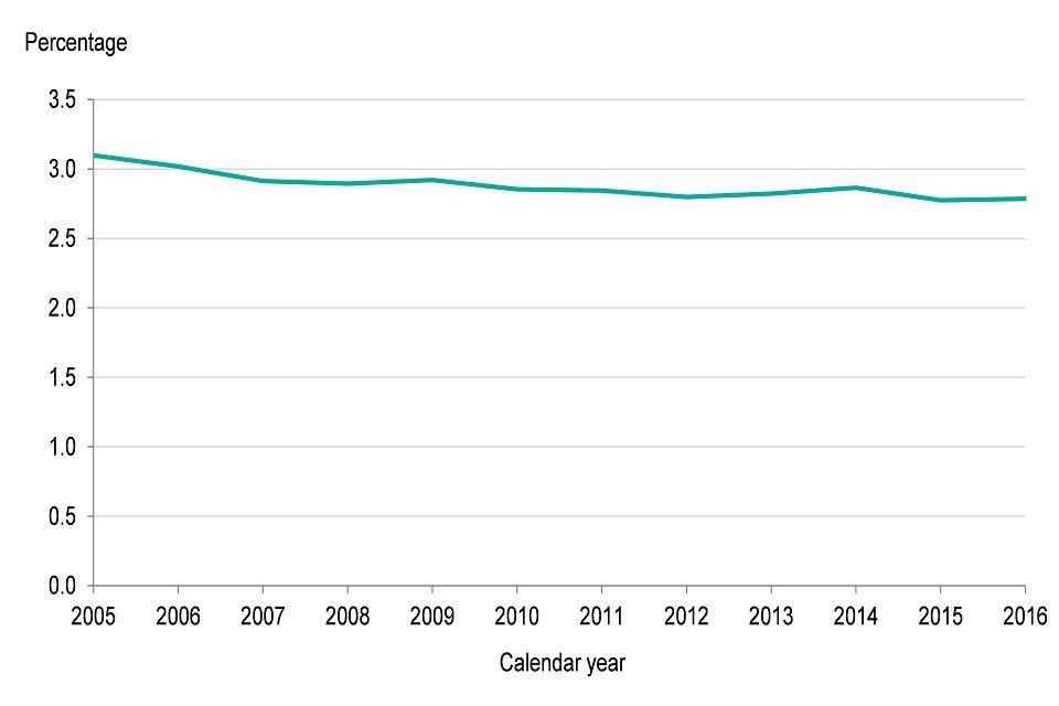 Low birthweight at full term of pregnancy is an important public health measure as it indicates whether the baby was able to grow as expected while in the womb. Considering only those babies which reach full term enables the pregnancy outcome to be considered, irrespective of prematurity and pre-term birth, which would otherwise dominate these statistics. Low birthweight can be associated with the ethnicity of mothers, smoking during pregnancy, younger maternal age and some medical complications such as maternal diabetes or hypertension (more prevalent at older maternal ages) [footnote 2],[footnote 4],[footnote 10]. Being born at low birthweight is an important marker along the trajectory of early child development, indicating an increased risk of poor health outcomes from birth onwards [footnote 1],[footnote 2]. The percentage of low birthweight babies at term in England has fallen slightly from 3.1% in 2005 to 2.8% in 2016 (Figure 4).