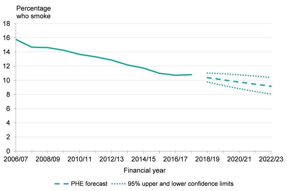 In England, smoking status is routinely recorded at the time of delivery and it is assumed that pregnant women smoking at this stage have smoked throughout their pregnancy. Smoking at the time of delivery has declined in recent years, with 13.6% of women smoking at the time of delivery in the financial year 2010 to 2011, falling to 10.8% in the financial year 2017 to 2018 (Figure 1). The time series analysis forecasting presented suggests that if this trend continues it will reduce to between 8.1% and 10.4% by 2022 to 2023.