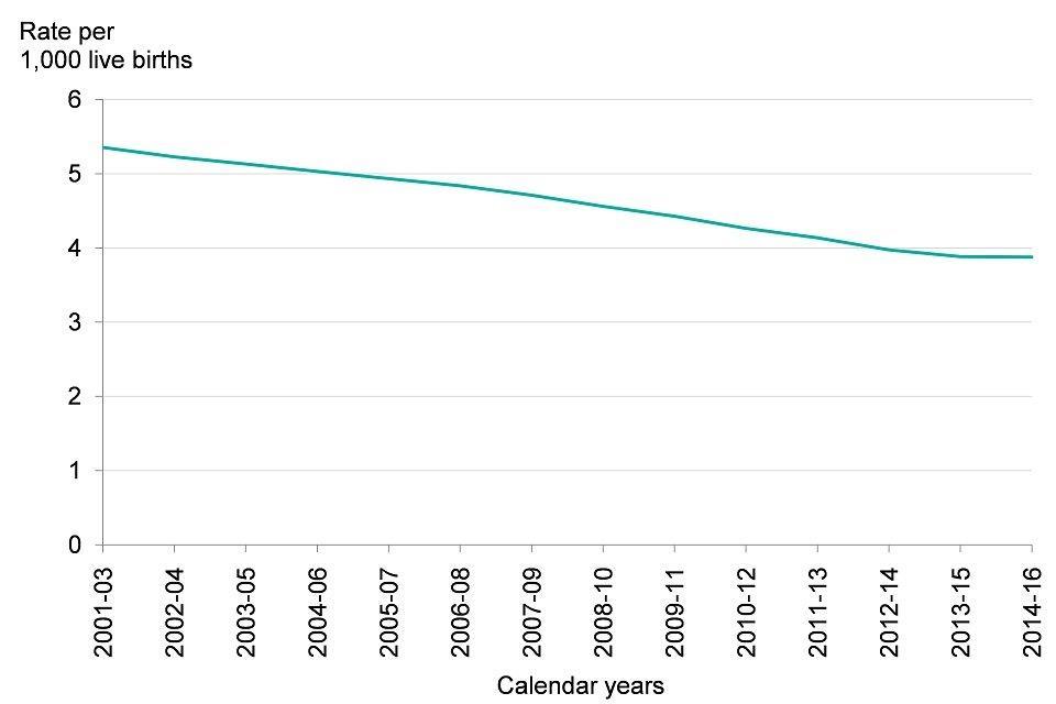 In England, the number of infants who die is relatively small and subject to considerable variation from year to year. As a result, the data are often considered on a three-year rolling average basis. The infant mortality rate fell from 5.4 per 1,000 live births in 2001 to 2003 to 3.9 in 2014 to 2016 (Figure 6). However, there was no decline between the latest 2 periods.