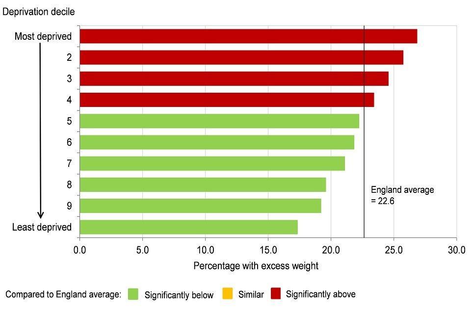 Figure 8: excess weight in 4 to 5 year olds by deprivation decile*, England, academic year 2016 to 2017 [Source: Public Health Outcomes Framework.]