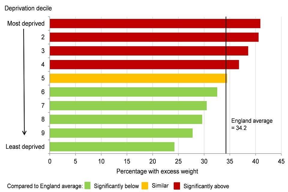 Figure 10: excess weight in 10 to 11 year olds by deprivation decile*, England, academic year 2016 to 2017 [Source: Public Health Outcomes Framework]