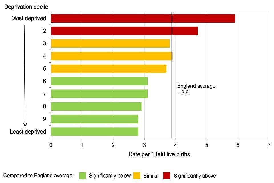 There is also wide variation across the country, in 2014 to 2016 the highest rate of 7.9 per 1,000 live births for any local authority area was almost 5 times higher than the lowest rate of 1.6.