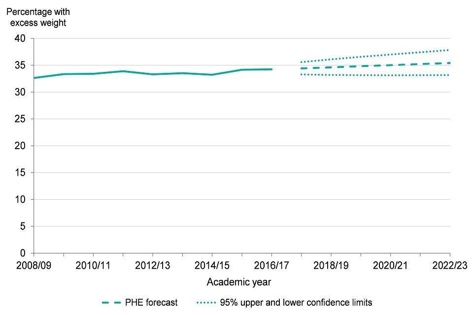 In the academic year 2016 to 2017, 34.2% of 10 to 11 year olds in England were overweight or obese, a statistically significant increase over the last eight years, up from 32.6% in the academic year 2008 to 2009. Time series analysis suggests that this percentage is likely to continue to rise in the next few years.