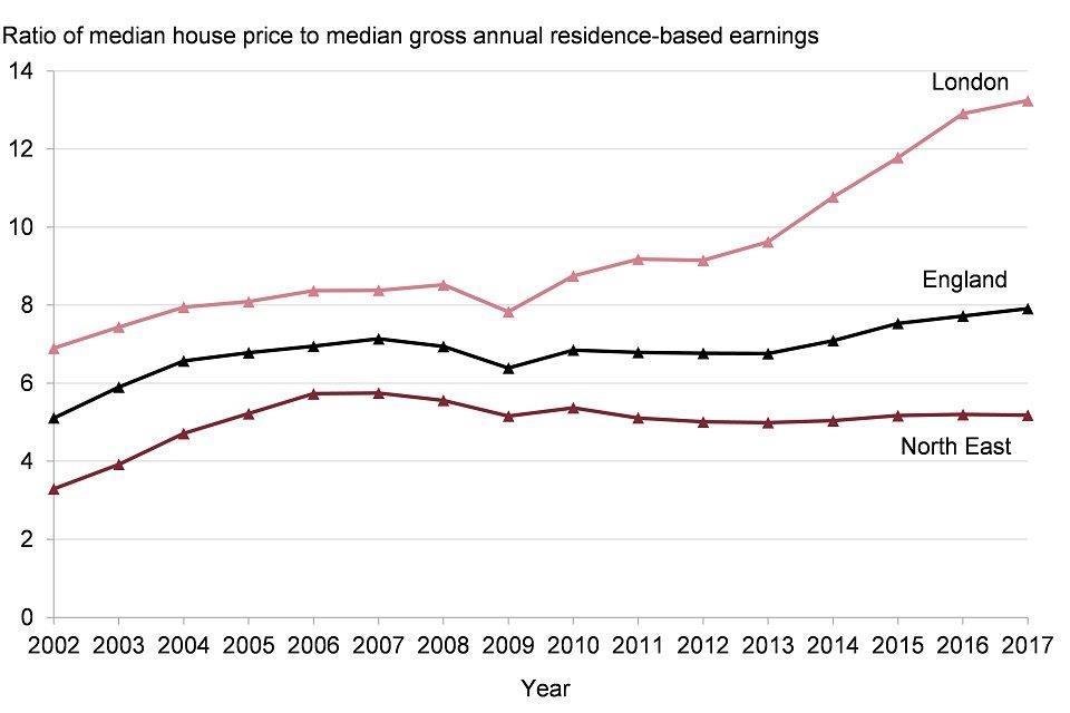 Figure 3: trend in ratio of median house price to median gross annual residence-based earnings, England, London and the North East, 2002 to 2017 [Source: Office for National Statistics, house price to residence-based earnings ratio]