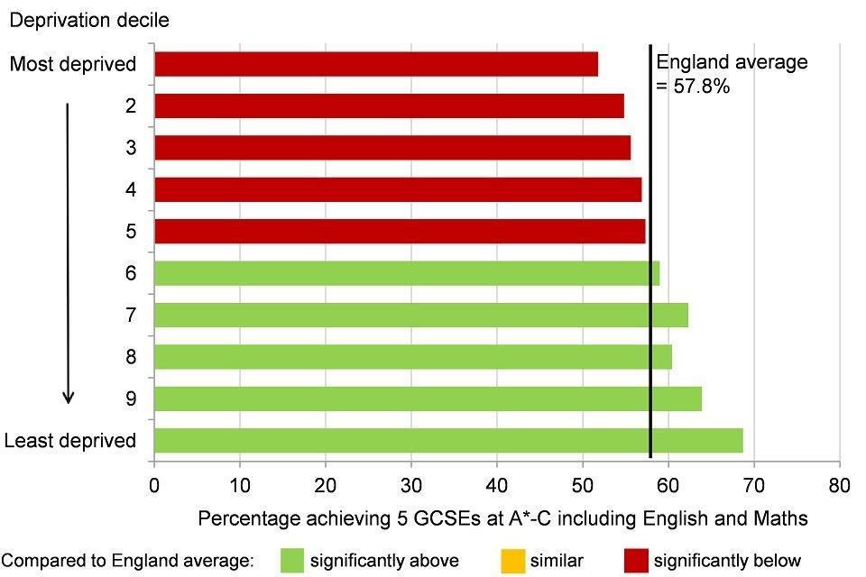 Figure 5: percentage of children achieving 5 GCSEs at A*-C including English and Maths, by deprivation decile*, England, academic year 2015 to 2016 [Source: Department for Education, Revised GCSE and equivalent results in England: 2015 to 2016]