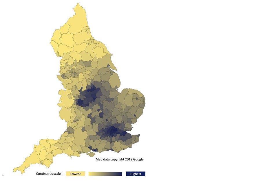 Figure 2: annual concentration of human-made population weighted fine particulate matter (PM2.5), by lower tier local authority, England, 2016 [Source: Wider determinants of health profile]