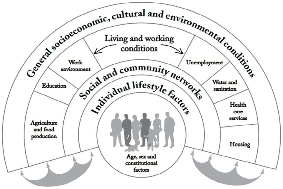 Dahlgren G and Whitehead M (1993) Tackling inequalities in health: what can we learn from what has been tried? Working paper prepared for the King’s Fund International Seminar on Tackling Inequalities in Health, September 1993, Ditchley Park, Oxfordshire. London, King’s Fund. In Dahlgren, G. and Whitehead, M. (2007). Editors. European Strategies for Tackling Social Inequities in Health: Levelling Up Part 2. Copenhagen: WHO Regional Office for Europe; pp. 20 to 32. ↩ ↩2