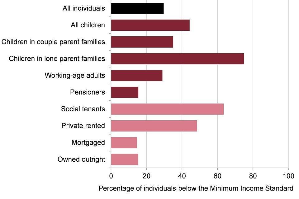 Figure 6: percentage of individuals below the Minimum Income Standard, by household characteristics, UK, financial year 2015 to 2016 [Source: Joseph Rowntree Foundation, Households below a Minimum Income Standard: 2008/09 - 2015/16 [See Methods, data and definitions - Minimum Income Standard]]