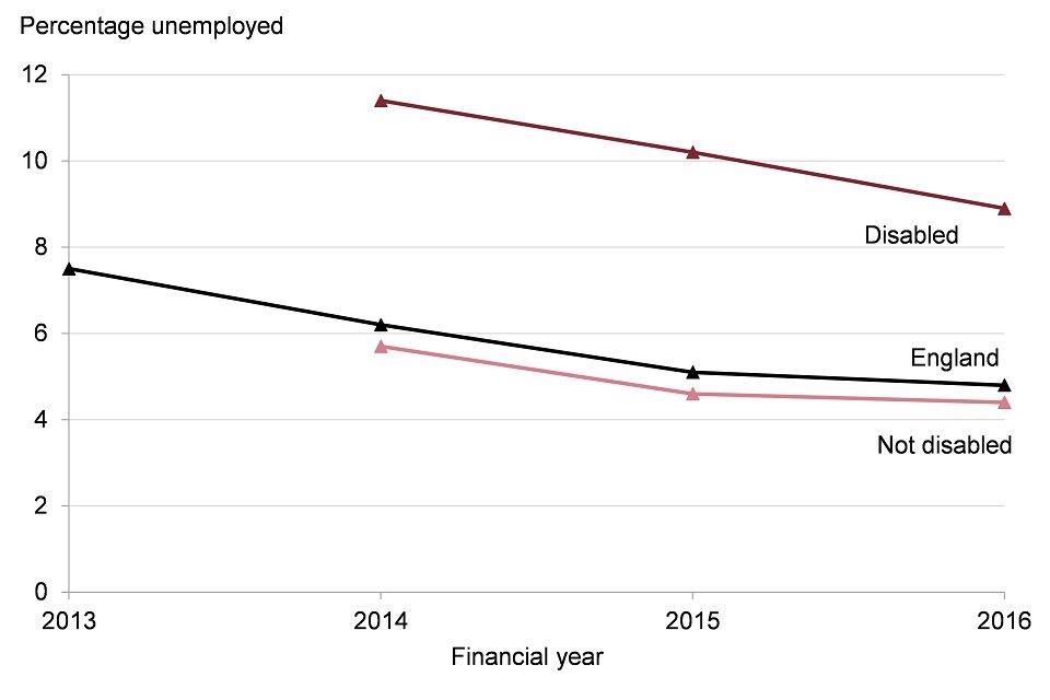 Figure 8: trend in percentage of the economically active population who are unemployed, by disability status, England, 2013 to 2016 [Source: NOMIS, Annual Population Survey/Labour Force Survey.]